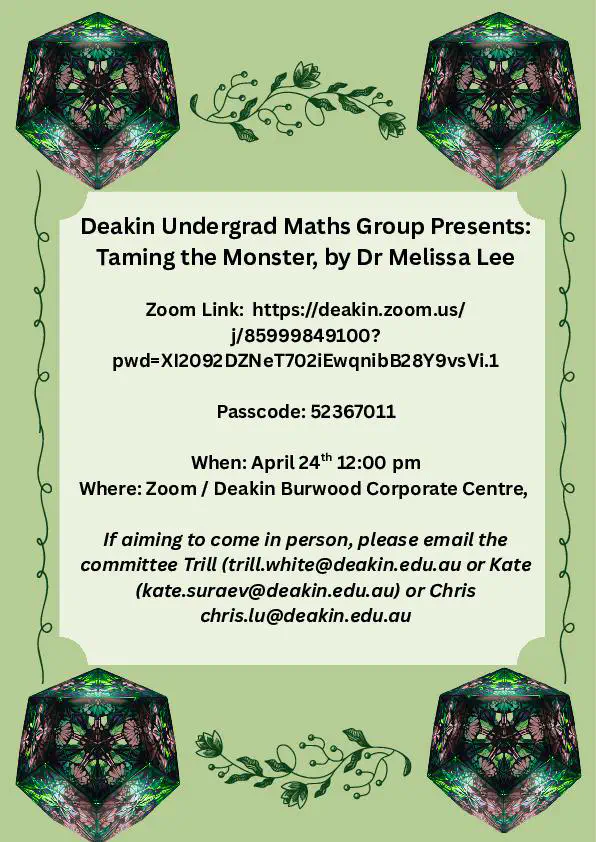 Abstract: Group theory, the study of symmetry, is fundamental to understanding our universe. The building blocks of finite groups (of symmetries) are called “simple groups”, and understanding them means that we understand a lot about finite groups in general. In this talk, I will discuss the Monster group, a very large simple group that has captured the imagination of many mathematicians since its discovery in the 1980s. I will also tell you about some recent work with colleagues Heiko Dietrich, Tomasz Popiel and Anthony Pisani on how we managed to tame the Monster by understanding its maximal subgroups.