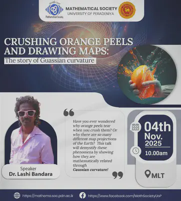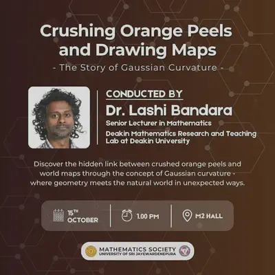 During his leave visiting extended family in Sri Lanka, Lashi was invited by Thanuja Paragoda from the University of Sri Jayawardenapura to give a talk to their undergraduate students. He gave a talk titled “Crushing Orange Peels and Drawing Maps: the story of Gaussian curvature”, organised by the Mathematics Society of USJ.